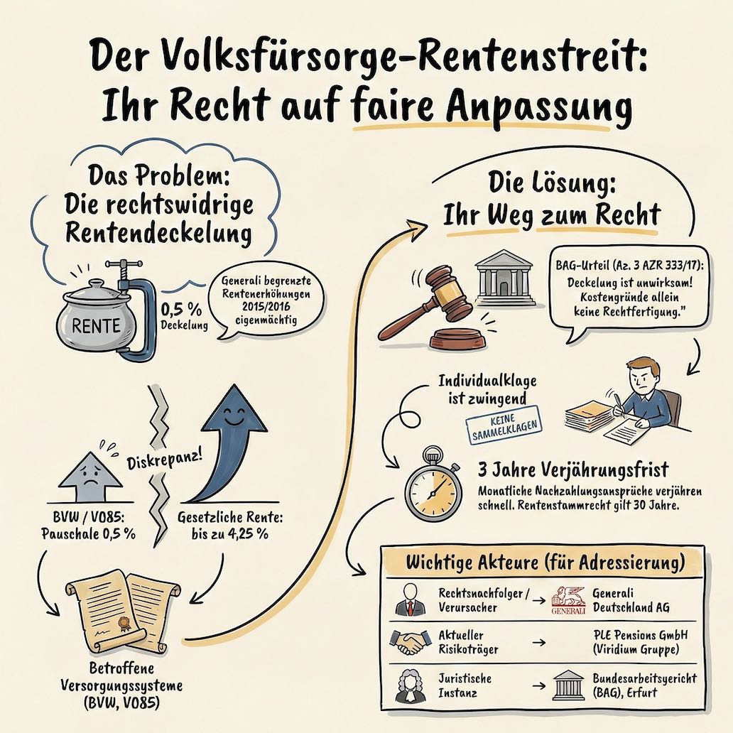 Wenn Ihre Betriebsrente auf dem BVW 1961 oder der VO85 der Volksfürsorge basiert, haben Sie grundsätzlich einen Anspruch darauf, dass Ihre Rente fair angepasst wird. Die Urteile des Bundesarbeitsgerichts haben gezeigt, dass einseitige Kürzungen durch den Arbeitgeber oft nicht rechtens sind. Ihre Ansprüche sind stark, aber Sie müssen sie möglicherweise aktiv einfordern.